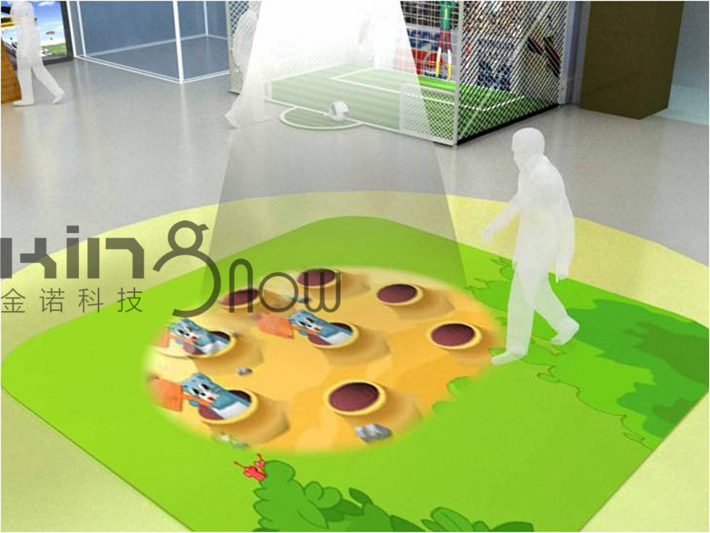 上方懸掛投影儀和KINECT圖像采集識別設(shè)備,進行地面投影。當(dāng)無人進入投影區(qū)域時,草地上有好多老鼠洞,偶爾一兩個洞里會有不同的地鼠跑出來四處張望,然后又跑回地下。界面中會有單人模式和雙人模式兩個按鈕,觀眾可以選擇游戲的單雙人模式,進行比分的評比或競賽。當(dāng)觀眾進入游戲,踩到地鼠的時候,地鼠會吱吱叫并暈倒在洞口,之后會對觀眾進行計分。在規(guī)定時間內(nèi),游戲結(jié)束后會顯示出觀眾的得分,并且可以通過存儲數(shù)據(jù),對參與觀眾的分數(shù)進行排名(月、周、日)。