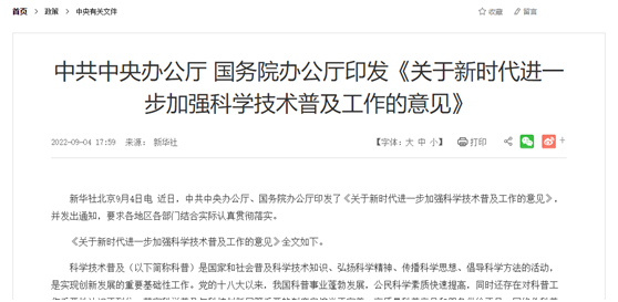 近日,中共中央辦公廳、國務(wù)院辦公廳印發(fā)《關(guān)于新時代進(jìn)一步加強科學(xué)技術(shù)普及工作的意見》(以下簡稱《意見》),要求堅持把科學(xué)普及放在與科技創(chuàng)新同等重要的位置,推動科普全面融... [2022-09-15]
