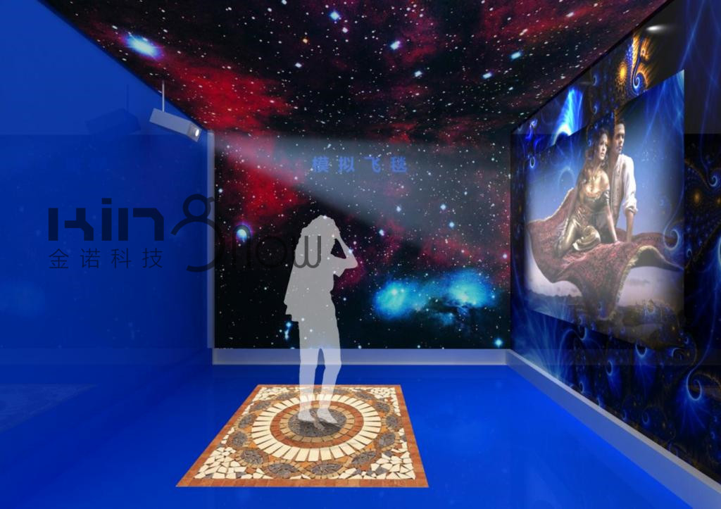 半封閉的展區(qū)內(nèi)一側(cè)展墻上是大幅的星空圖像的噴繪,展區(qū)背面是一大塊藍色背景的展墻,展區(qū)前方的展墻上通過投影循環(huán)播放飛毯飛行的視頻剪輯。展墻上安裝攝像頭上方有一個攝像頭,地面擺放一塊地毯,攝像頭對準地毯。觀眾可以站上地毯,攝像頭拍攝下站在地毯上的觀眾,通過視頻摳像技術(shù),將站在地毯上的觀眾與液晶屏上播放的畫面相結(jié)合,觀眾可以看到自己站在飛毯上,跟隨著飛毯穿越森林,讓觀眾感覺到自己真的操控飛毯,在魔幻世界中飛行一樣。