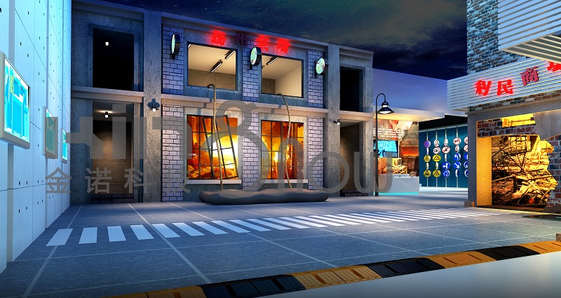 展項(xiàng)設(shè)計(jì)獨(dú)立的體驗(yàn)空間,借助造景環(huán)境、煙霧機(jī)、暖風(fēng)扇、火焰燈、顯示屏等設(shè)施,模擬一個已經(jīng)發(fā)生火災(zāi)的高層住宅現(xiàn)場,參與者在昏暗的并伴有煙霧的場景中進(jìn)行逃生模擬,只有采取正確的逃生措施才不會觸發(fā)錯誤提示,否則會觸發(fā)錯誤提示。
