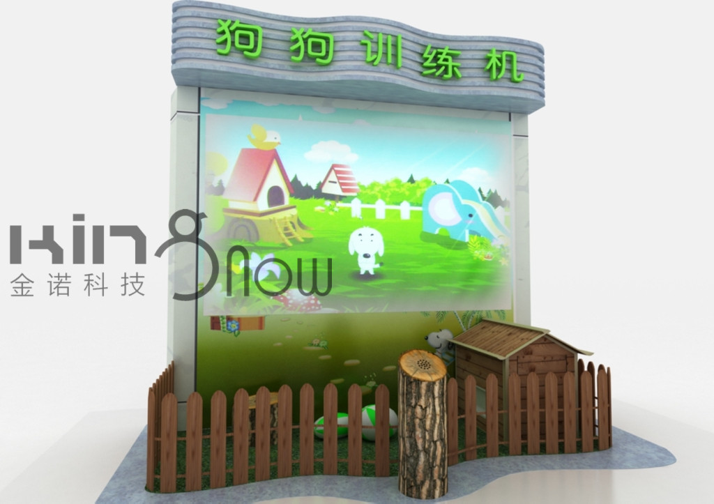前方設(shè)置一個樹樁造型的話筒,觀眾通過話筒與屏幕中的虛擬動物進行互動,體驗訓練動物的技巧與方法。屏幕中隨機出現(xiàn)一條漂亮的虛擬狗,正搖著尾巴,看著你。觀眾對著話筒喊出話語,訓練虛擬狗去尋找畫面之外的目標,如骨頭或小彩球等。例如:向右轉(zhuǎn)、過河、跳躍、趴下、回家、上滑梯、算數(shù)等,畫面中的卡通狗作出相應反應,例如:觀眾問:1+1等于幾?小狗會“汪汪”的。